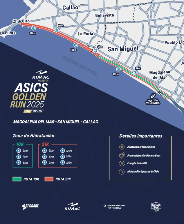 La ruta de la ASICS Golden Run 2025 recorrerá algunos de los distritos más emblemáticos de Lima, teniendo como punto de partida y llegada el distrito de Magdalena del Mar. En la distancia de 10K, los corredores disfrutarán de un recorrido a lo largo de la Costa Verde, atravesando los malecones de Magdalena y San Miguel. Por su parte, los participantes del 21K continuarán hasta La Perla, llegando a Chucuito (Callao) antes de retornar a Magdalena. Un circuito técnico y desafiante que combina exigencia física, vistas únicas del litoral limeño y la energía que caracteriza a esta competencia internacional.